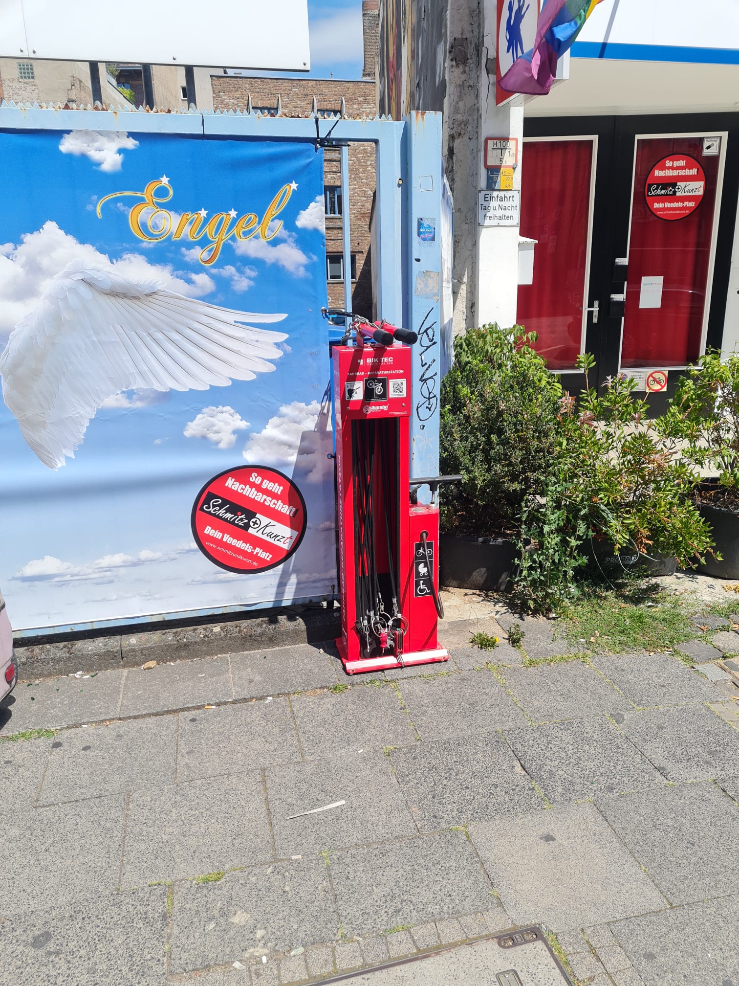 Die Station wurde durch finanzielle Unterstützung unserer Nachbarschaft am Schmitzundkunzt fest installiert und ist nonstop für euch - unsere Nachbarinnen und Nachbarn - zugänglich. Ihr könnt an dieser Reparatursäule jederzeit auf schnellstem Wege eure Fahrradreparaturen vollziehen. Die Station beinhaltet alle Fahrradwerkzeuge, die man benötigt.